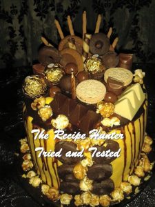 Consists of a 4 layer sponge, 2 layers chocolate sponge, lemon sponge, frosted with lemon butter cream icing, pinstripe drizzle