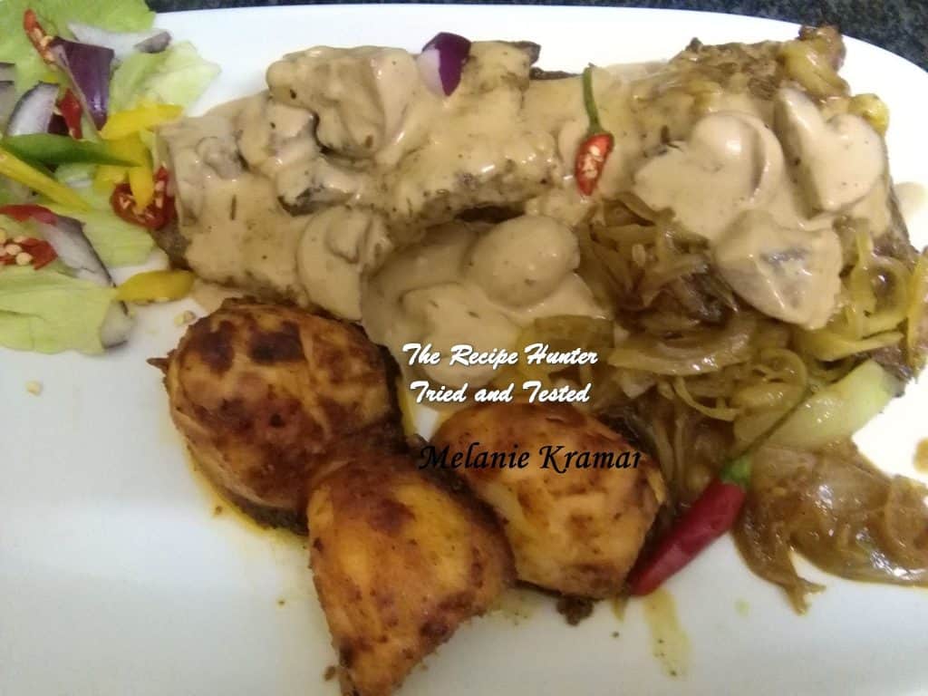 I daily get recipes in my email which I mostly delete without opening unless something really interesting appears in the subject line. This time it was ‘the best steak marinade in existence’. I had taken out steak this morning so naturally was intrigued, and the ingredients are pretty simple and in all our kitchens. Decided on mushroom sauce with it and stumbled on a different recipe on another group, different to my norm, Dianne Mushroom Sauce. Cool. Made that. OK Potatoes next. Came across Tandoori Potatoes on another Group. Easy peasy I didn’t have to think on what to make for supper. Oh, the caramelized onions were my own.