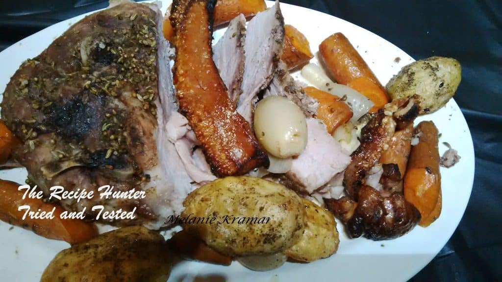 Preheat oven to 250 degrees C. Make slits in pork and insert crushed garlic.