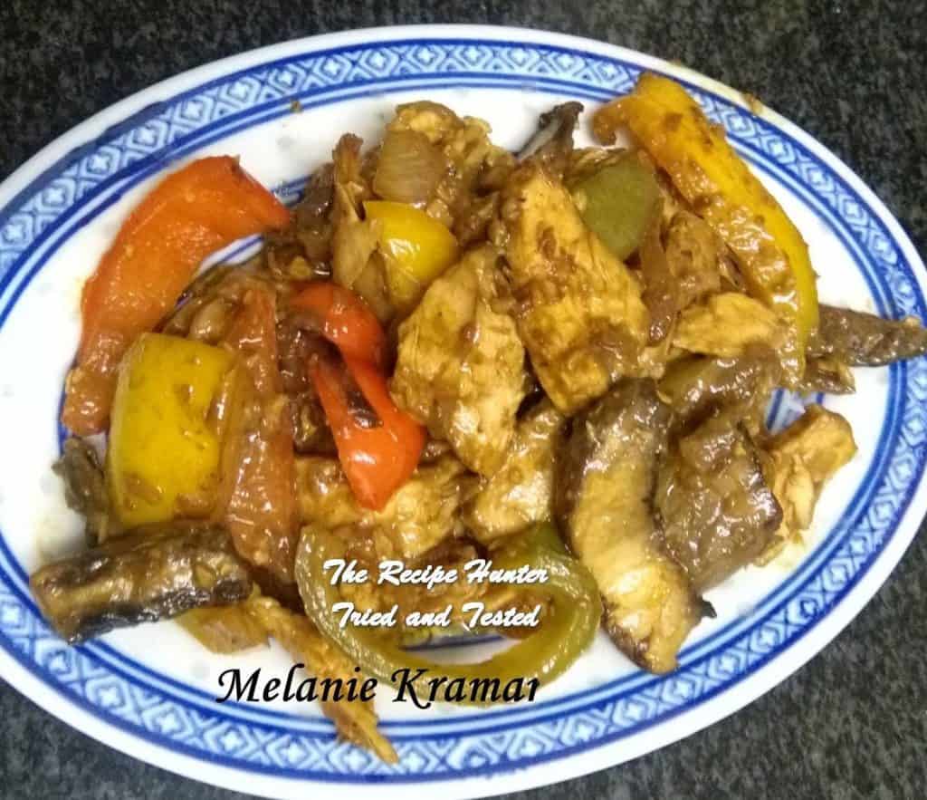 I’ve always made Satay Beef before and usually it doesn’t include vegetables. I’ve decided to try Satay Chicken for a change, and add peppers and mushrooms. This is the method I was taught many years ago. The more modern version requires the Satay Chicken to be skewered and grilled, so this is my version. Regrettably, it was another one of my last-minute decisions, and I did not have spring onion to garnish.