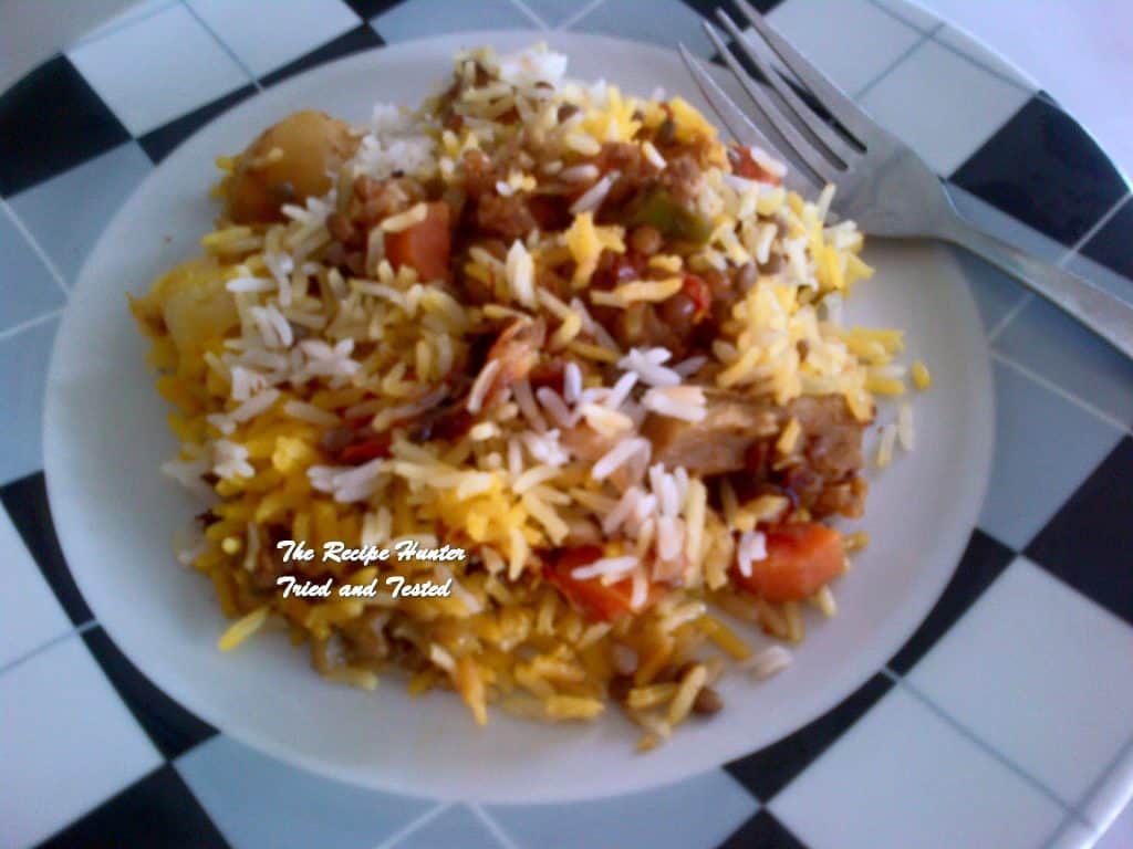 Then add a layer of rice and lentils. Add the vegetable mixture. Top with fried potatoes. Last layer is the last of the rice.